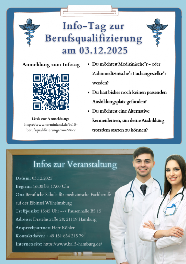 Die Berufliche Schule für medizinische Fachberufe auf der Elbinsel Wilhelmsburg (BS15) bietet in enger Kooperation mit Arzt- und Zahnarztpraxen schulpflichtigen Jugendlichen eine Berufsqualifizierungsmaßnahme zur/zum Medizinischen Fachangestellten (MFA) und Zahnmedizinischen Fachangestellten (ZFA) an.